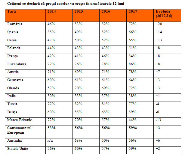 România conduce clasamentul, cu 72% dintre respondenți considerând ca prețul caselor va crește în următorul an, urmată de Spania (66%) și Cehia (65%). Clasamentul poate fi explicat prin faptul că cele trei țări au o economie în creștere. Față de studiul realizat anul trecut, numărul românilor care sunt pesimiști în legătură cu evoluția prețurilor a crescut cu 20 de puncte procentuale, cea mai mare creștere dintre țările europene; de menționat însă că aceștia se așteaptă la o creștere ușoară.